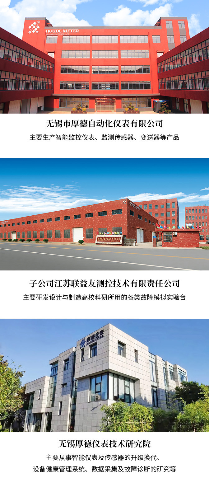 無錫市厚德自動化儀表有限公司創建于2000年,專業生產大型旋轉機械裝置的轉子與軸承等在線監測保護系統與故障預判診斷系統,主要產品有汽輪機安全監視系統TSI、壓縮機機械保護系統MPS、振動傳感器、電渦流傳感器、轉速傳感器、加速度傳感器等,可在線監測軸系振動、軸系轉速、軸向位移、軸承振動、設備基礎振動、相位等關鍵性參數。公司設有儀表部、傳感器部、自動化控制系統工程部和可靠性試驗室。同時公司旗下設有厚德儀表技術研究院,主要致力于智能儀表及傳感器的升級換代、在線遠程故障診斷系統的開發以及培訓相關事宜;全資子公司江蘇聯益友測控技術有限責任公司,主要設計制造高校科研用各類實驗臺、各類典型的故障機理分析試驗、厚德故障診斷共享實驗室、高校共建實驗室等。