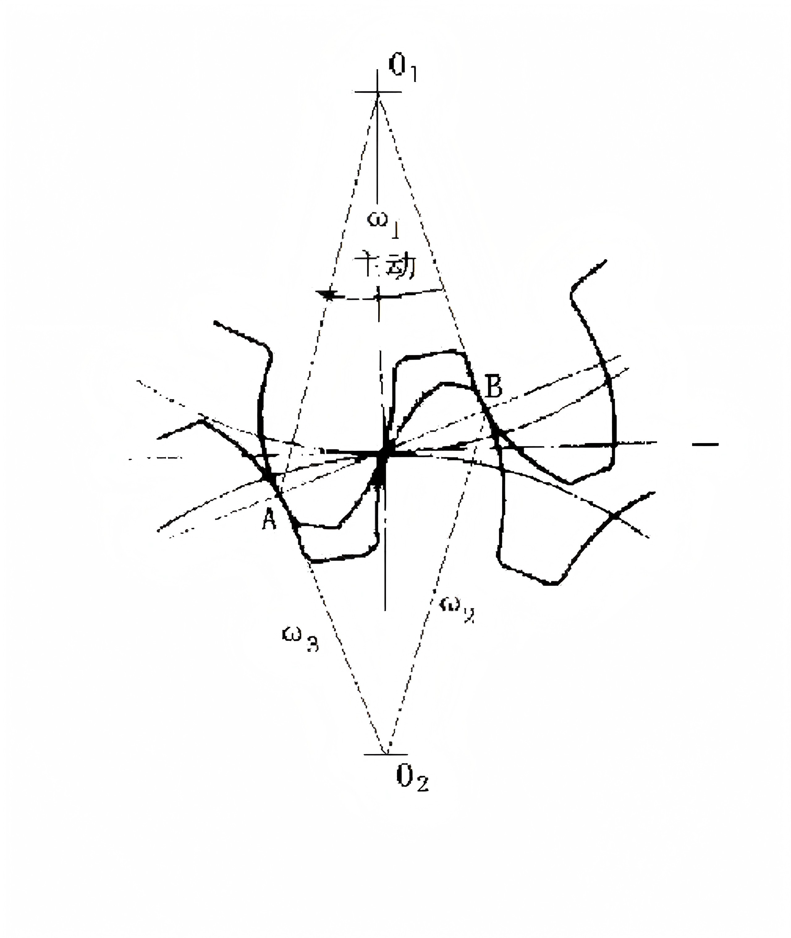 2是被動輪的軸心。假定主動輪以ω1作勻角速度運動,A、B分別為兩個嚙合點,則有O