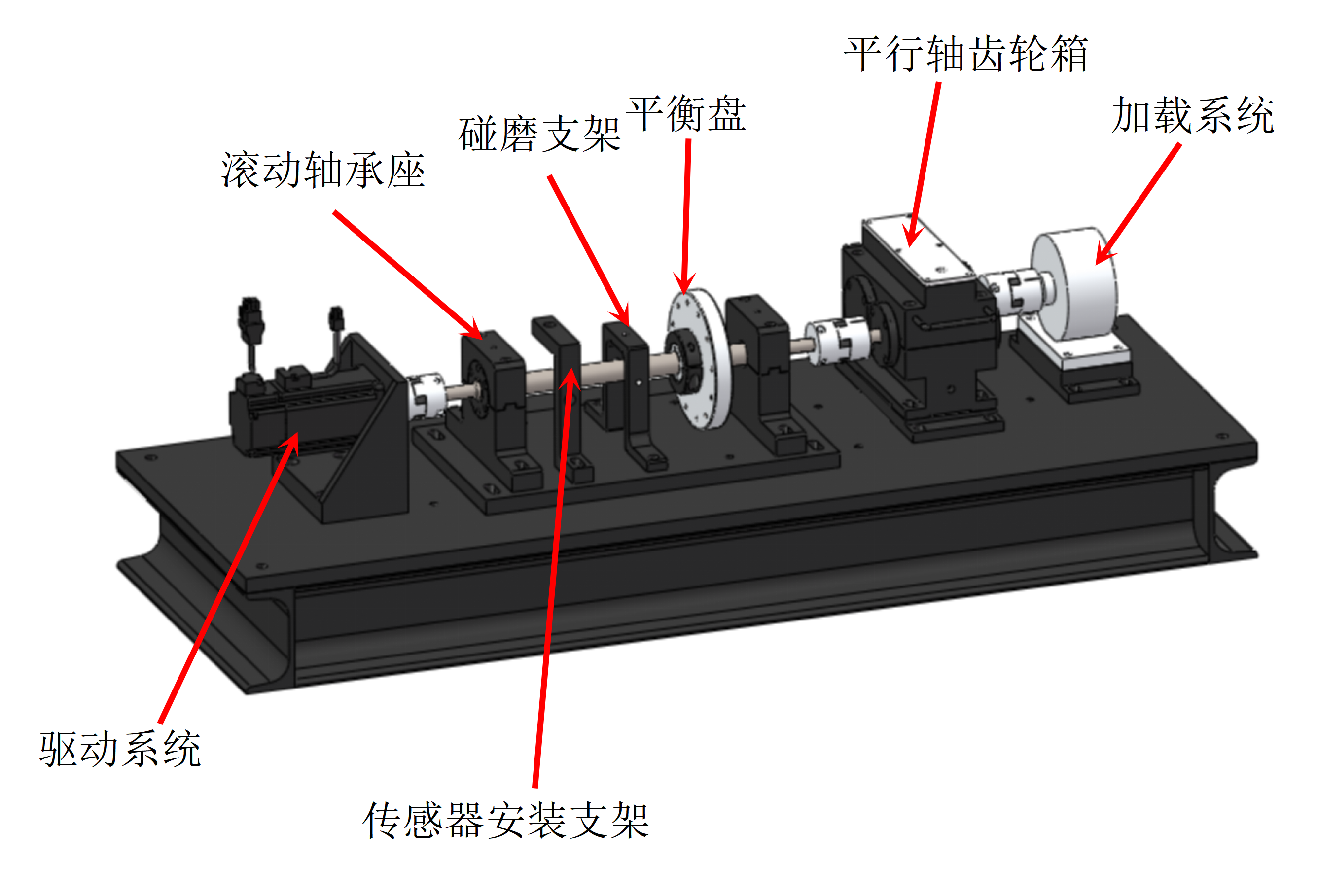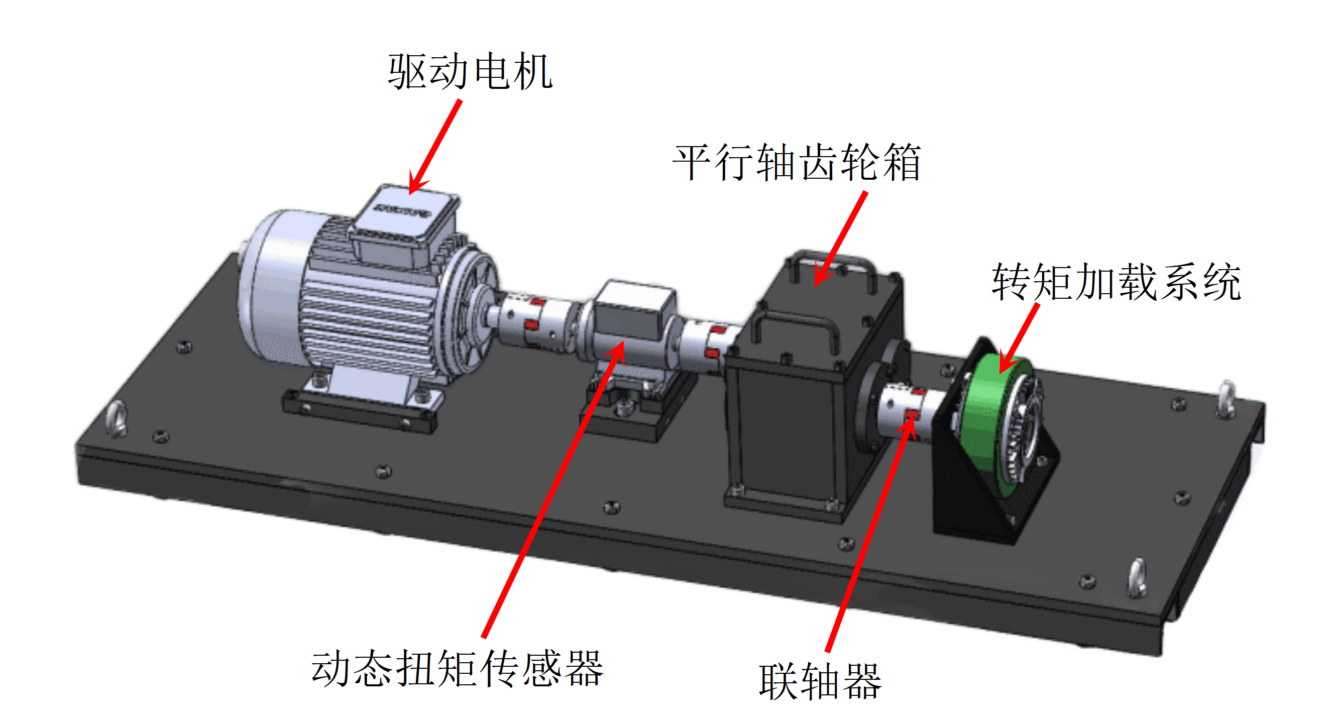 本實驗系統(tǒng)由伺服電機、轉(zhuǎn)子系統(tǒng)、傳感器安裝支架、聯(lián)軸器、平行軸齒輪箱、轉(zhuǎn)矩加載系統(tǒng)、平臺底板、試驗臺控制系統(tǒng)等組成。整體設(shè)備尺寸為1000mm×350mm×365mm。